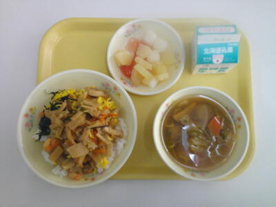 ごはん 牛乳 どさんこ汁 親子丼の具 ほうれん草のおひたし 焼きプリンタル