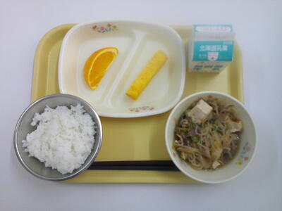 ごはん 牛乳 すき焼き 厚焼き卵 オレンジ