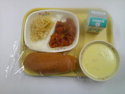 コッペパン 牛乳 コーンポタージュ 鶏肉のナポリタン仕立て 大根サラダ
