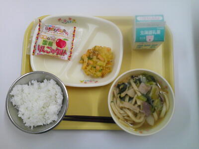 減量ごはん 牛乳 五目うどん 野菜かき揚げ りんごのタルト