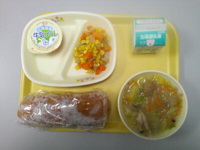 揚げパン 牛乳 キャベツと肉団子のスープ べーコンと野菜のソテー 牛乳プリン