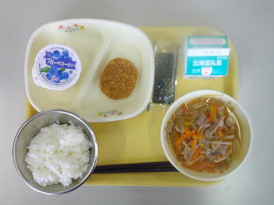 減量ごはん 牛乳 みそラーメン うの花コロッケ ブルーベリーゼリー 焼きのり