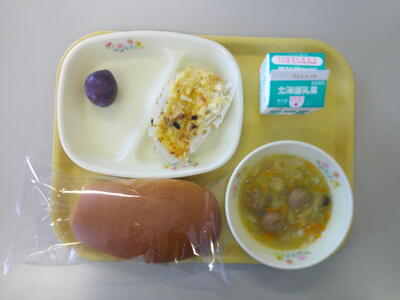 黒糖パン 牛乳 キャベツと肉団子のスープ グラタン プルーン