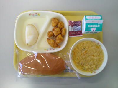 コッペパン 牛乳 酸辣湯 鶏肉ハーブフライ 梨 チョコクリーム