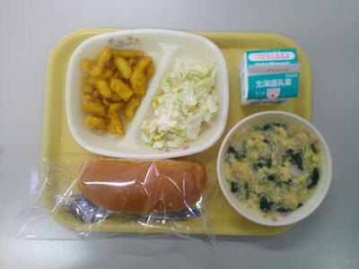 コッペパン 牛乳 ひき肉スープ いかから揚げ キャベツとコーンのサラダ