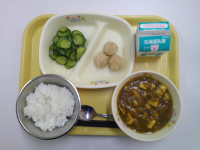 ごはん 牛乳 カレー豆腐 えびシュウマイ( 3個) きゅうりの塩昆布和え