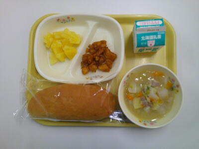 コッペパン 牛乳 ポトフ 鶏肉のバーベキューソース パイン缶