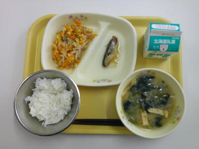 ごはん 牛乳 みそ汁(ほうれん草・大根・油揚け) いわしの味噌煮 人参シリシリ