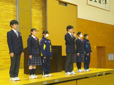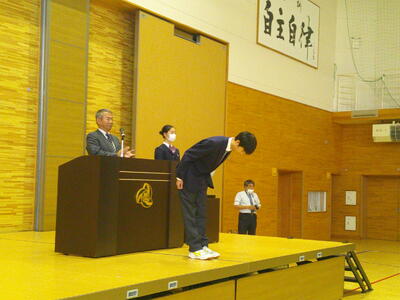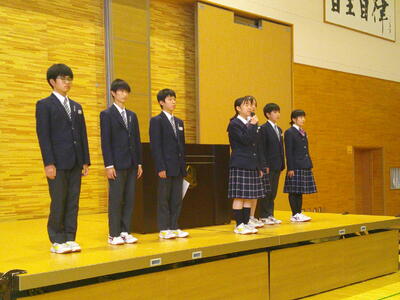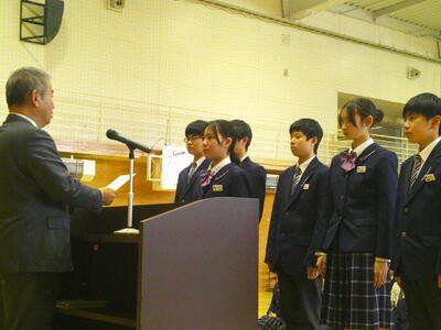 先日の生徒会選挙で当選した生徒会役員と各委員長が校長先生から認証状を手渡されました。