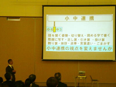 校区内研修会 投稿: tomoe (11/11) 11月10日。 巴中校区内の小学校の先生が巴中学校に来校し、小中合同の研修会が行われました。 全体会の様子 80名程の小学校の先生方が来校しました。 全体会後は授業の見学をしています。 生徒たちも、久しぶりに小学校の先生に会えて喜んでいる姿も見られました。 中学校の卒業後や社会に出るところまでを見通した連携ができるようにしていきたいものです。 Tweet -