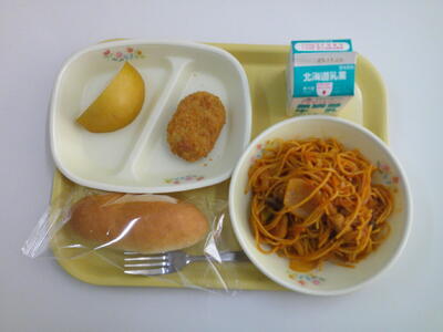 小型コッペパン 牛乳 スパゲティナポリタン 大豆コロッケ 梨