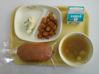 コッペパン 牛乳 高野豆腐のスープ 鶏肉のバーベキューソース ポテトサラダ