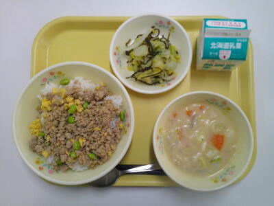 ごはん 牛乳 呉汁 三色丼 白菜の塩昆布和え