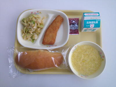 コッペパン 牛乳 つぶつぶコーンスープ えびカツ キャベツとツナのサラダ チョコクリーム