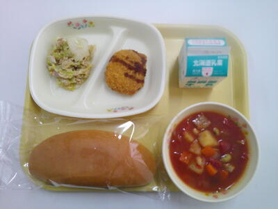 ソフトフランスパン 牛乳 チキンブラウンソース煮 大豆コロッケ オレンジ
