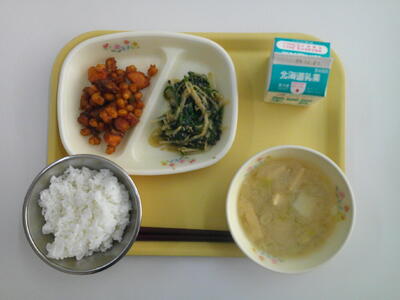 ごはん 牛乳 みそ汁(じゃがいも、油揚げ) 鮭と大豆のべっこう煮 ほうれん草ともやしのごま和え