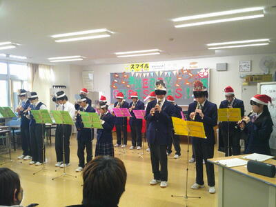生徒がリコーダー演奏や、グループに分かれてハンドベルやダンス、クイズを行い、参加者を楽しませました。